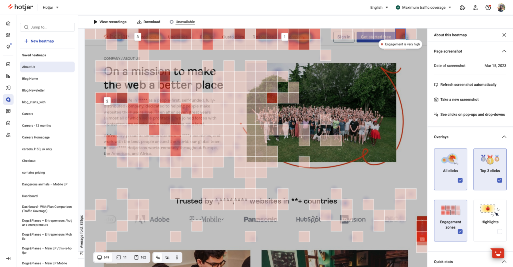 Heatmaps serve as visual tools that empower data-driven decisions for tasks like A/B testing, updates, and website redesigns. They extend their utility into broader business contexts, providing tangible evidence for essential changes, making it challenging to dispute the insights they present. Hotjar Heatmaps facilitate continuous data collection, allowing the filtering and creation of specialized heatmaps based on user attributes. This, in turn, empowers the swift extraction of targeted insights, personalized to various roles and trial statuses.